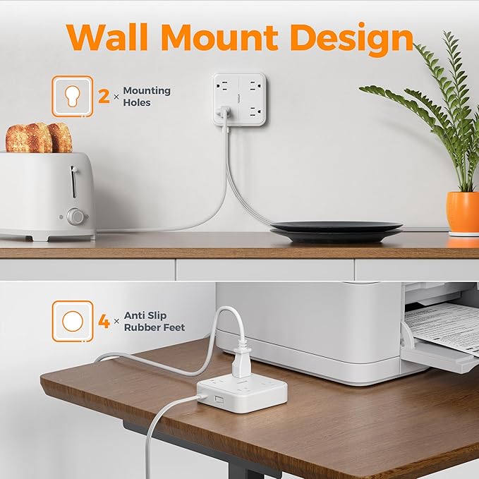 - Mountable Wall Outlet Extender: Featuring 2 wall mount holes for easy space management, this flat power strip offers versatile installation options on workbenches, walls, under counters, etc; 4 rubber feet keep it securely in place, preventing slips and slides