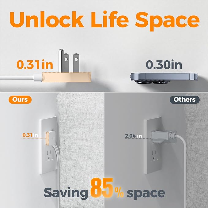 - Flat Extension Cord 10Ft: With only 0.31 inch flat head design, flat power strip can easily fit in tight spots and hide behind sofa, bed, nightstand or other furniture indoor; 45 degree right angle design create an extra space for other plug below without blocking