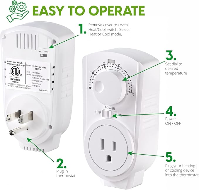 - EASY TO OPERATE: Just plug in this adjustable thermostat, select heat / cool mode with the user-friendly switch and it will automatically turn on or off your heating or cooling devices through your preset target temperature.