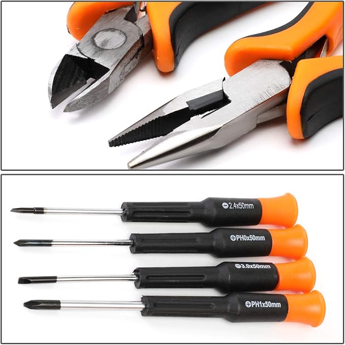 - PRODUCT SPECIFICATIONS: This kit includes [1] 20 piece Bit Set; [1] 4 piece Precision Screwdriver Set; [1] Mini Long Nose Pliers; [1] Mini Diagonal Cutting Plier; [9] 1/4" Sockets; [1] Ratchet Bit Driver; and [1] Bits Holder
