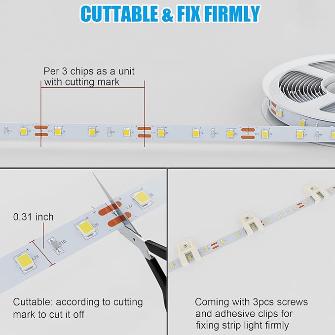 - Cuttable and Linkable: The light strips made of single-sided board with flexible feature can be bent and won't easy to break, its surface is with cutting mark and can be linked by connectors(connectors not included)