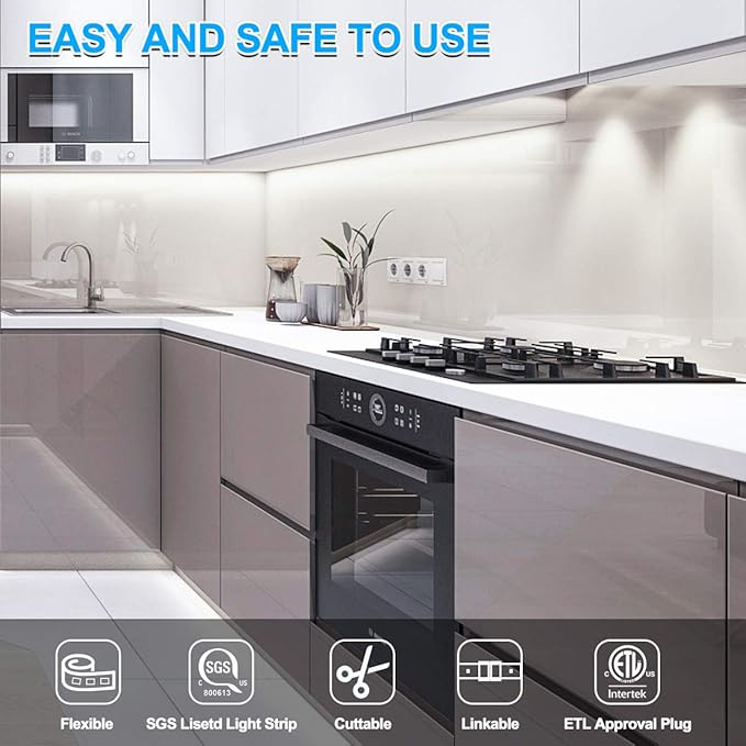 - Easy and Safe to Use: Strong self-adhesive backing tape can be sticked to any dry and clean indoor surface to install the strip lighting easily coming with extra adhesive clips and tape to fix it firmly. And the led strip was certificated by SGS and its power supply got ETL certification with short circuit protection. You can use it safely.