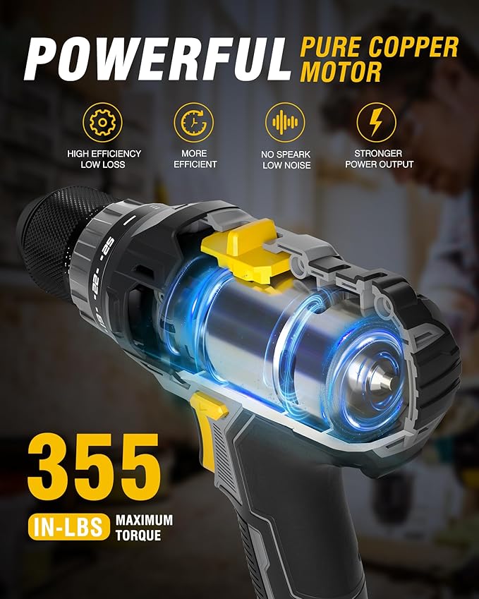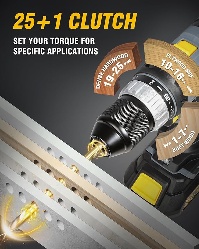 - ⚡【25+1 Clutch & 355 In-lbs Torque】RIDA's cordless drill features a precision clutch to prevent overdriving screws (0-355 in-lbs/40Nm max). With 25 torque settings for versatile applications + 1 drilling mode, it makes DIY projects effortless and error-free!
