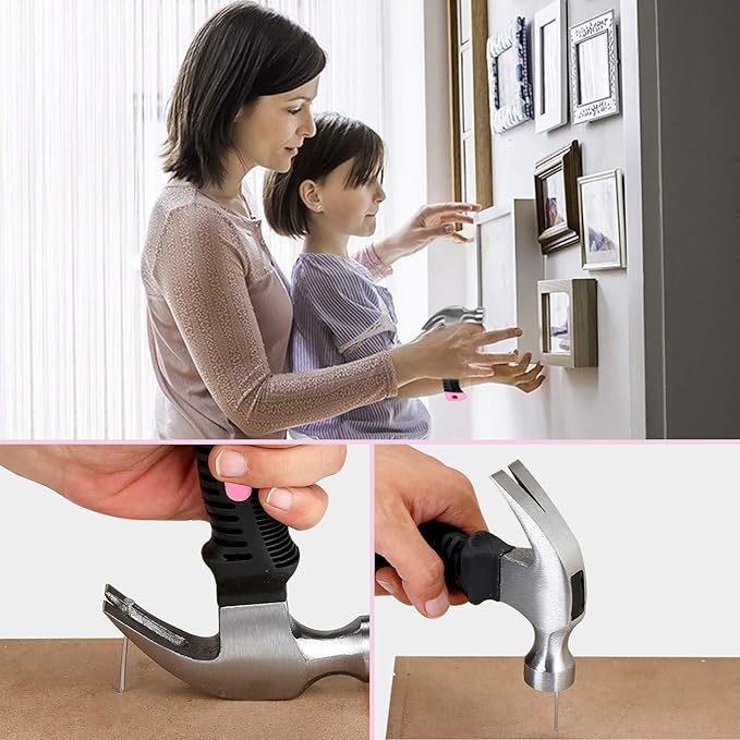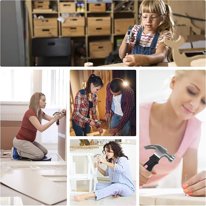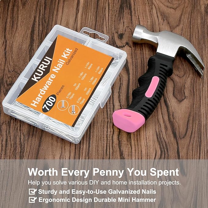 - HIGH-CLASS MATERIALS – The 560Pcs assorted nails are all made from heavy-duty carbon steel and double galvanized for better anti-corrosive and anti-rust performance. The woman small claw hammer consists of a small hammer head forged of strong and robust carbon steel and a soft anti-slip TPR handle. The metal part of the hammer is specially processed to be rust-proof and durable, it is built to last tens of years.
