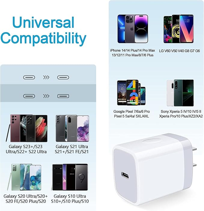 - 【Wide Compatibility】:Type c wall charger box for Samsung Galaxy S25 Ultra S24 Ultra,S24+,S23+,S23 Ultra,S22 Ultra,S21 FE S20 S10 S9 S8 Plus,S7,S6,Note 20 Ultra,A56,A36,A16 5G,A15 5G,A25,A55,A35,A24,A54,A14 5G,A25,A10e A11 A12,A13,A23,A33,A04s,A03s,A52,A53,F23,A72,A73,iPhone 16e,16,16 Pro,16 Plus,16 Pro Max,15,15 Pro Max,15 Plus,14 Plus,14 Pro Max,13 Pro Max,12 13 Mini,12 11 Pro Max,Xs Max,SE,8 7 6 Plus,Google Pixel 9,9 Pro XL,8a,8 Pro,7 Pro 7a 6 Pro 6a 5a 4a 5 5XL 4XL 3XL 2XL,LG Stylo 6 4 5 G6+ G7 One Fit G8X G8 G8S Thinq,Moto G Power,G Stylus,G6 G7 Plus Play and more.