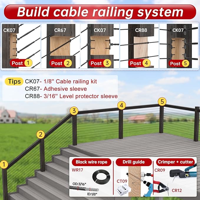 - 【Advice for constructing a system】 To help you construct a whole black wood system, we recommend the following product combinations from Muzata, including with 1/8" black toggle turnbuckle MUZATA CK07, black adhesive washer CR67, black level protector sleeve Muzata CR88, ID-1/8" vinyl coated black wire rope WR17, hydraulic crimper CR09, cable cutter CR12, drill guide CT09