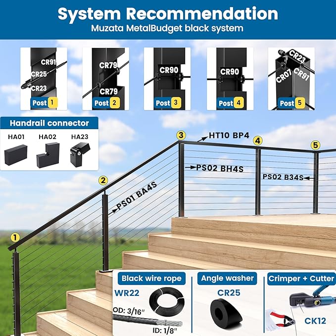 - 【Advice for constructing a system】 To help you build MetalEasy black cable railing system more efficiently, we recommend the following product combinations from Muzata, including cable railing kits CR23 CR07, wire rope WR22, protector sleeve CR79 CR90, adhesive washer CR91, angled washer CR25, cable cutter and hydraulic crimper CK12, posts PS01-BA4S PS02-BH4S B34S, handrails HT10-BP4, handrail connectors HA01 HA02 HA23