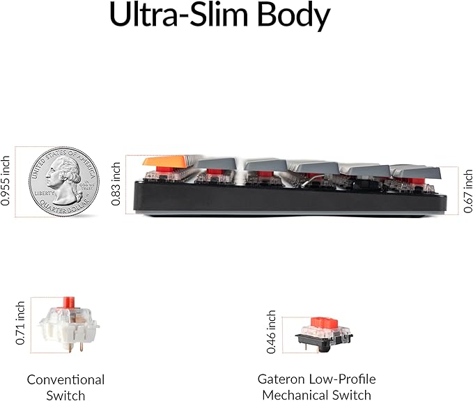 - The redesigned low-profile Gateron mechanical switch is 40% slimmer than conventional switches with a shorter pre-travel and total travel distance that triggers an input and feedback faster than conventional/normal-profile mechanical switches.
