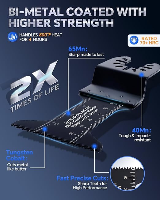 - Durable Material: Made of high speed steel and high carbon steel. Thick gauge metal and special manufacturing technology ensure excellent wear resistance and durability. Our oscillating multitool blades are manufactured with special techniques and thick gauge metals due to which it becomes durable for a long period.