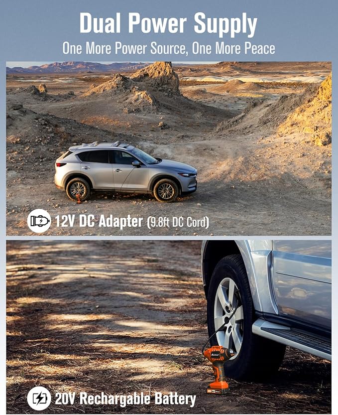 - [Dual Power Supply for Maximum Flexibility] Powered by a 20V rechargeable Li-ion battery or a 12V DC adapter (with a 9.8ft cord), this portable tire inflator for car gives you options. Never stress about a dead battery on the road—just plug it into your car’s 12V outlet for uninterrupted use. Perfect for roadside emergencies