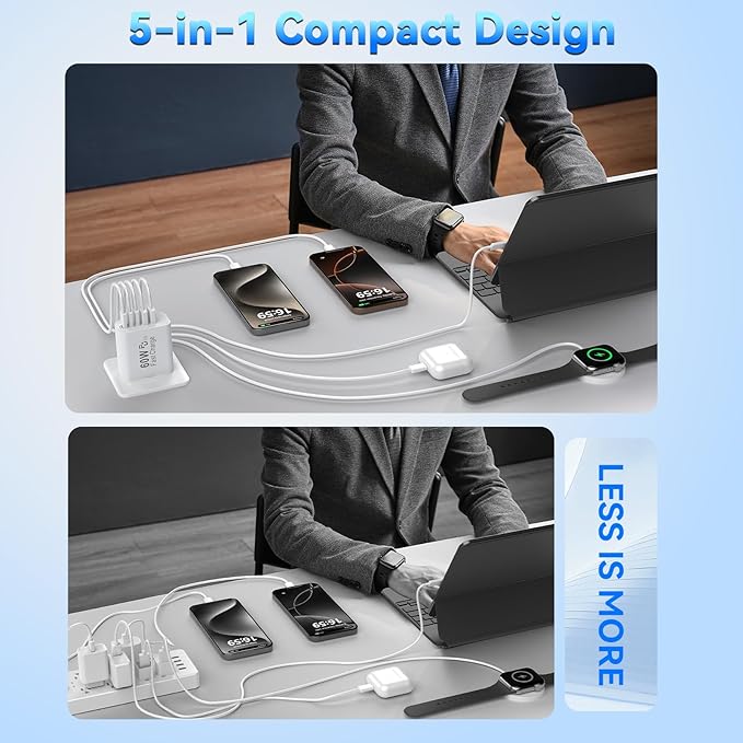- 【Multi 5-Port Fast Charging Brick】:The 60W USB C Charging blocks has three USB-C ports and two USB-A ports output, support total power up to 60W. Has two single port ports with MAX output of 30w, and the USB A port supports a maximum of 5V/3.1A. Allows you to charge 5 devices simultaneously to minimize waiting time, also save your space, one of our wall charger can instead of 5 single USB C&USB port wall chargers