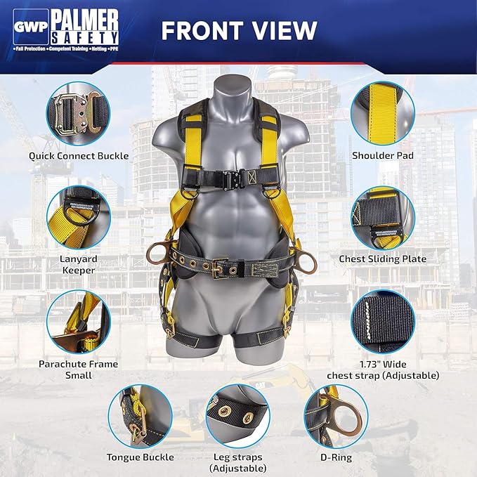 • ๐Ÿงฐ EASY TO USE: The tongue and buckle leg straps and quick connect chest make the Palmer Safety harness quick and easy to put on and take off, with simple, intuitive buckles and straps that can be quickly adjusted to fit the user's body, even while wearing gloves or other protective gear.