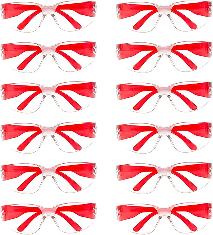 - Color & One Size Fits Most – Fits adults, teens, and older children. 12 piece pack of red safety glasses. Usage can include, but is not limited to: Medical, Industrial, Dental, Construction, Janitorial, School, Daycare, College, etc.
