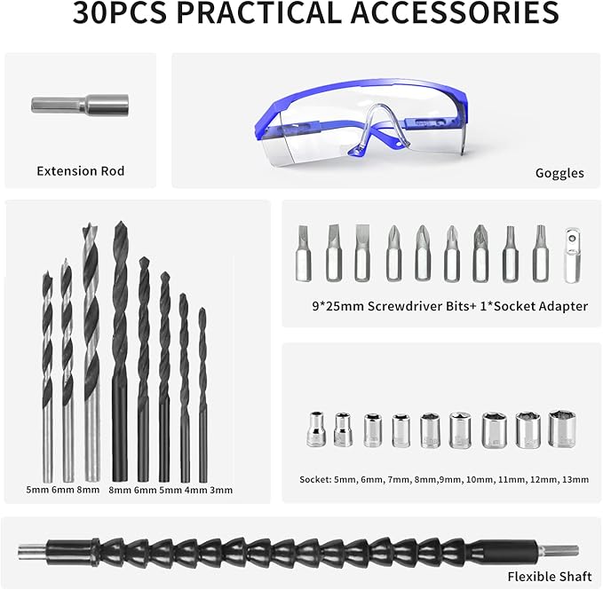 - 【Package List 】 You will get: 1 x GardenJoy Cordless Power Drill, 1 x 1.5 AH Battery, 1 x Fast Charger, 5 x HSS Twist Drill Bits, 3 x Wood Drill Bits, 9 x Screwdriver Bits, 1 x Socket Adapter, 1 x Extension Rod, 9 x Sockets, 1 x Flexible Shaft, 1 x Goggles, 1 x User Manual, 24-Hour Customer Service.
