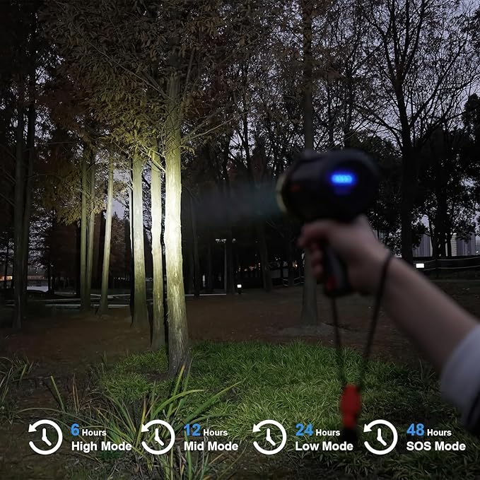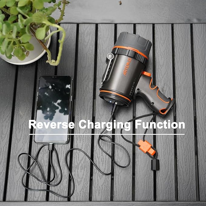 - RECHARGEABLE & PORTABLE: This 2000 lumen hand held spot lights comes with the 100V-240V home adapter with 3.9 feet USB cord. This waterproof handheld spotlight will work 6 hours on high mode, can also be used as a power bank to charge your smart devices