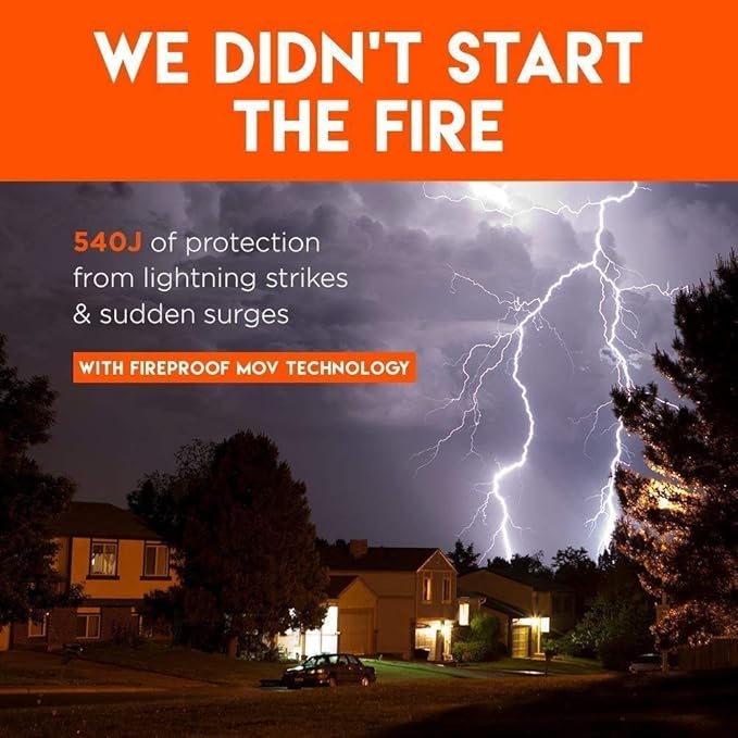 - 540 Joules of surge protection from all types of electrical damage. Built-in fireproof technology handles surges, without starting a fire. Billy Joel would be proud.