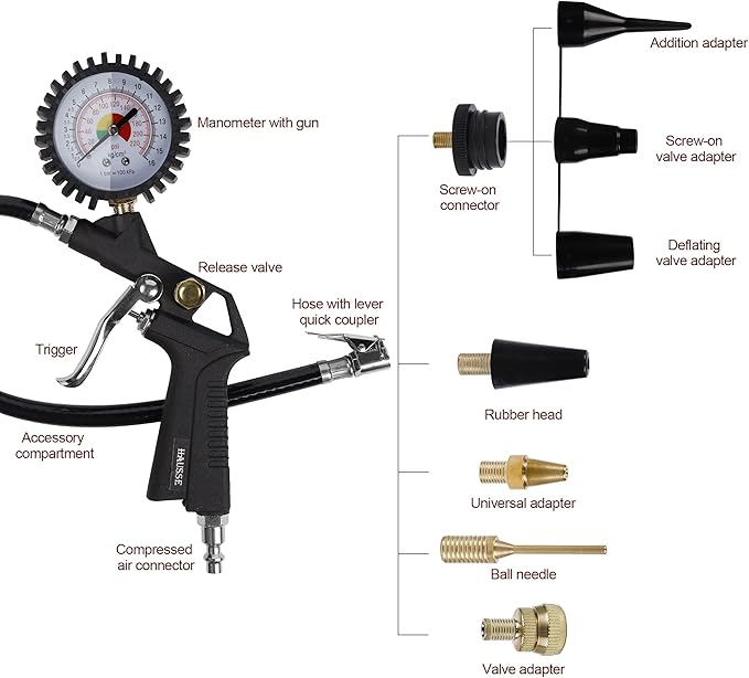 Hausse Heavy Duty Air Compressor Accessory Kit, Air Blow Gun and Air Hose Fittings, 1/4" NPT Air Tool Kit with 100 PSI Tire Inflator Gauge