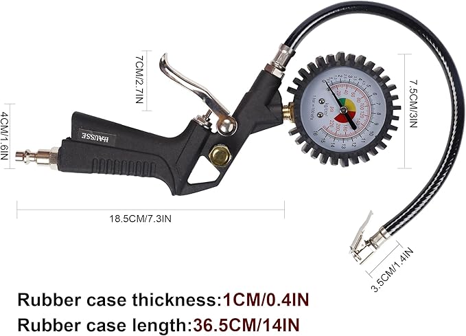 - Tire Inflator with Gauge: Tire inflator with ventilation valve and pressure gauge, air blow gun are all combined in one easy to use unit. Clear and easy to read display dial with 0-220 psi gauge (No more than 140 PSI is recommended). Heavy duty metal construction that is corrosion-resistant and very durable.