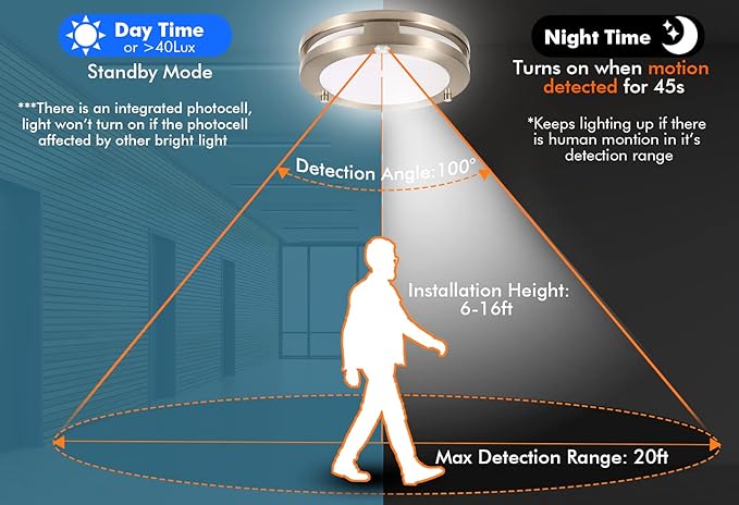 - 【Motion Activate】Light automatically comes on for 45s when motion detected at night time or brightness is less then 40lux and then turn off. It will keep turning on if there is motion on its detection range. Detection range is up to 100 degrees and a distance of 20 feet.