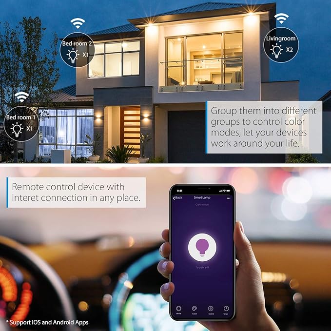 - GROUP CONTROL:the smart lights can be controlled individually, or you can set your smart lights in one group and turn them on/off, change the color or the brightness at the same time.