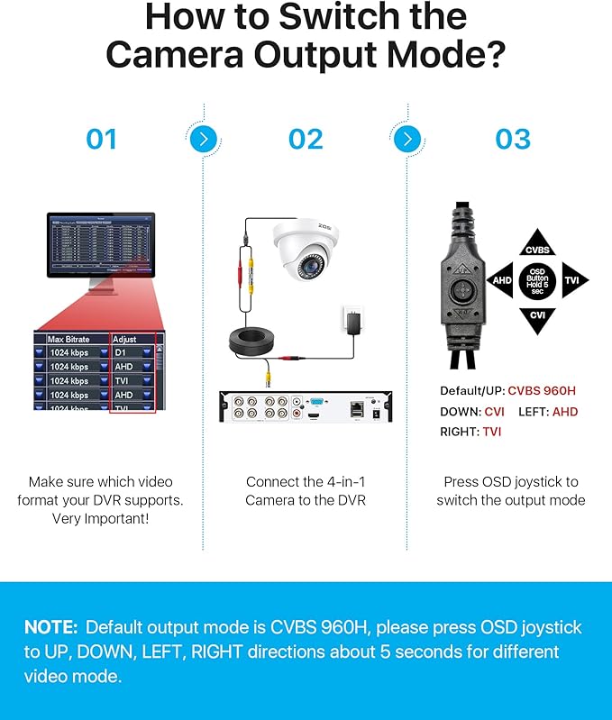 - (4). [ Default Video Mode is Analog 960H Mode ] __ Compatible with HD-CVI/TVI/AHD/Analog DVRs. To view 1080p images, ensure your DVR supports 1080p resolution.