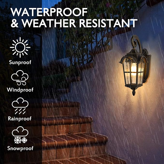 - Weather resistant and suitable for wet locations, this outdoor wall lantern features sturdy aluminum construction and solid water glass shade in a black finish, anti-rust and anti-corrosion