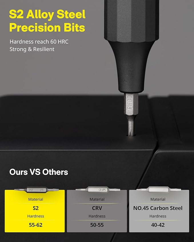- AESTHETICS & DURABILITY - The mini screwdriver set boasts a sleek and sleekly polished metal exterior, crafted from high-grade aluminum alloy materials and coated with an eco-friendly nickel finish to ward off rust. Plus, its bits are made of tough S2 alloy steel that achieves a whopping 60HRC hardness.