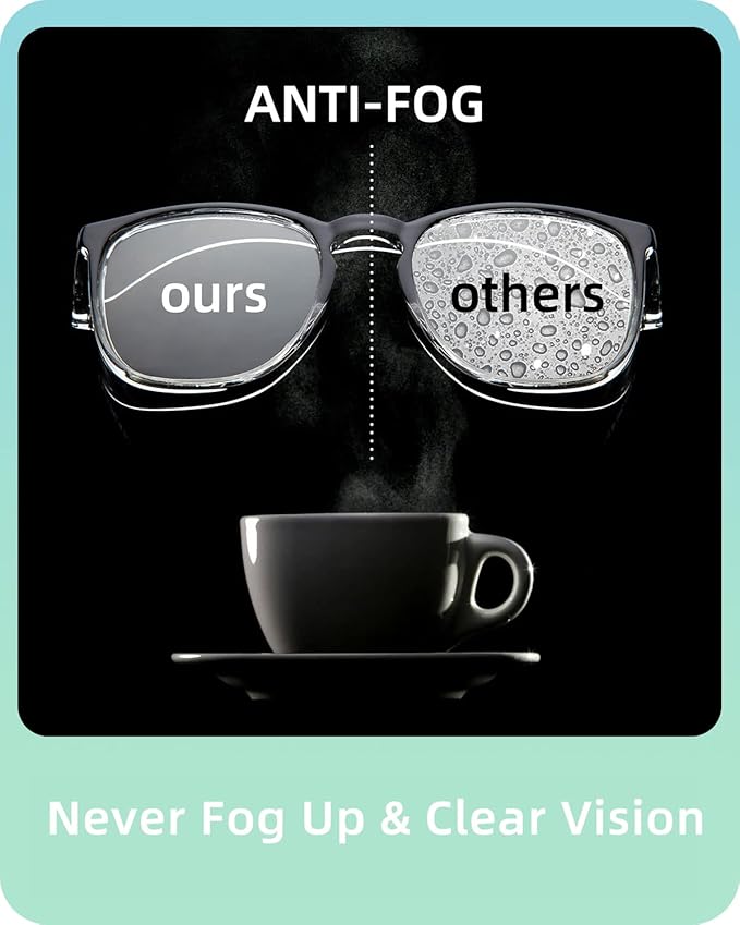 - ANTI-FOG LENS - Another most important feature of our safety goggles is the anti-fog lens. It comes with double-side coating, which keeps vision clear even drinking hot water. Furthermore, the anti-fog feature could last about 2 years