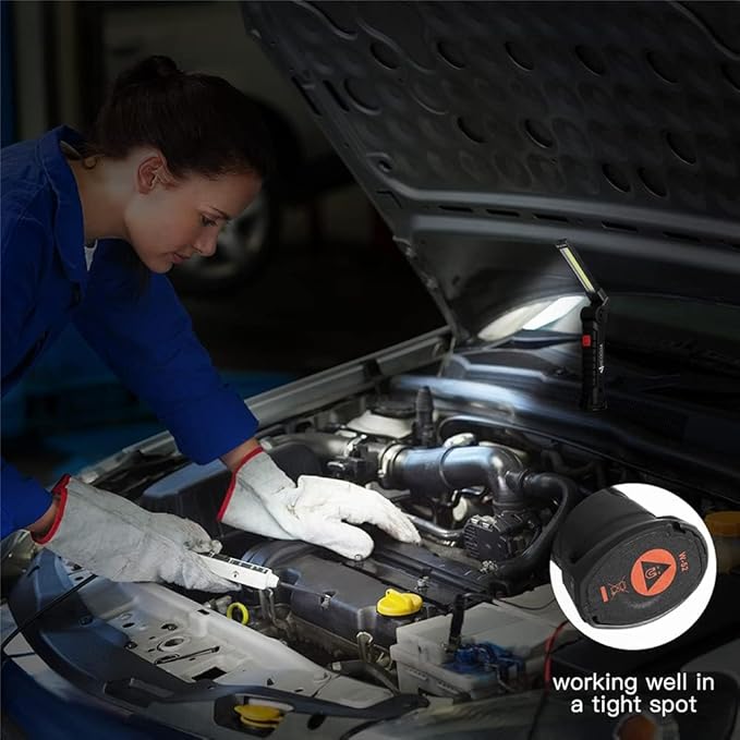 - 【Waterproof and Widely Used】Water-resistant, ensure the emergency light works fine on rainy or snow days. the COB work light is perfect for car repairing, emergency, camping, traveling, hiking, Fishing, CNC lathes, maintenance, workshop, garage, power outages, home lighting, work at night and working under the hood. (BUT DO NOT PUT IN WATER)