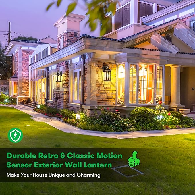 - 100% Aluminum & Anti-Rust, Waterproof: Execllent quality, this motion sensor wall light is made 100% heavy-duty rugged aluminum, can be used for years without fading. Even if it is placed outdoors for a long time, the outdoor motion sensor lantern will always remain bright and new, and it is not easy to be contaminated with dust. After high specification test, the motion sensor porch light can be used in any outdoor environment and extreme weather, rain and snow, ultra-high or low temperature