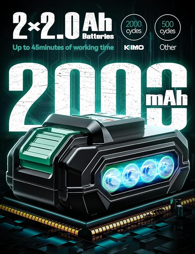 - โฑใ๐๐ฑ๐.๐๐๐ก ๐๐๐ญ๐ญ๐๐ซ๐ข๐๐ฌ ๐๐จ๐ซ ๐๐๐ฌ๐ฒ ๐๐๐๐ค๐ฎ๐ฉ ใNever fret over battery life again with the KIMO cordless drill with battery and charger featuring two 2000mAH batteries! Equipped with 20V high-capacity batteries, seamlessly switch between them for uninterrupted workflow. Experience Fast charging in just 60 minutes, twice as fast as usual. It has 3 power indicator lights, ensuring you always know your battery level.