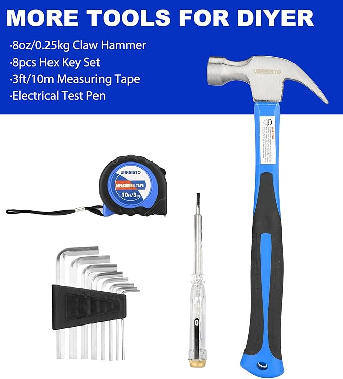 - 【24-Piece Useful Tool Set】This tool set comes with all the most useful tools for home maintenance and daily use. It includes a hammer, 6pcs pliers, 6pcs magnetic screwdrivers, 8pcs hex key set, measuring tape, voltage tester pen and all in one storage bag.