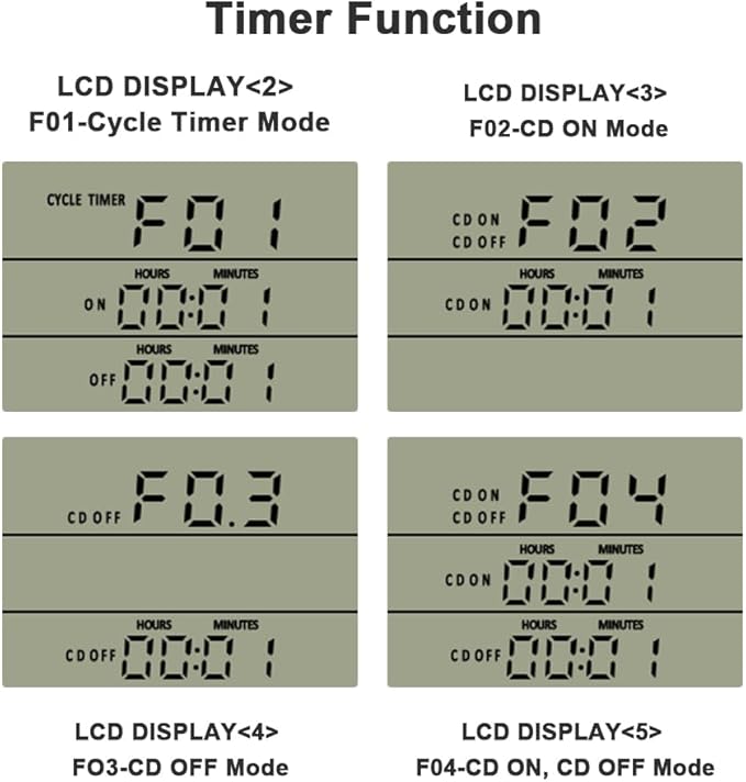 - 【Timing Function】 Thermostat Timer socket has F01-F04 mode, F01 cycle time control, F02 countdown on mode, F03 countdown off mode and F04 countdown on, countdown off mode, Time range is 0-99 hours and 59 minutes.