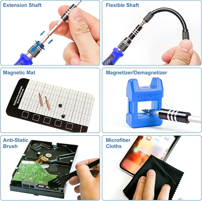 - 【Innovation Design】 We have professionally designed this laptop screwdriver kit for maximum humanization, make your repair job easier and more efficient. The screwdriver features a non-slip grip and rubberized, ergonomic handle with swivel top, provides a comfortable grip and smoothly spinning. Magnetic bit holder transmits magnetism through the bit, helping you handle tiny screws. And flexible extension shaft is 360° bendable, perfect for removing fastener in tight spots