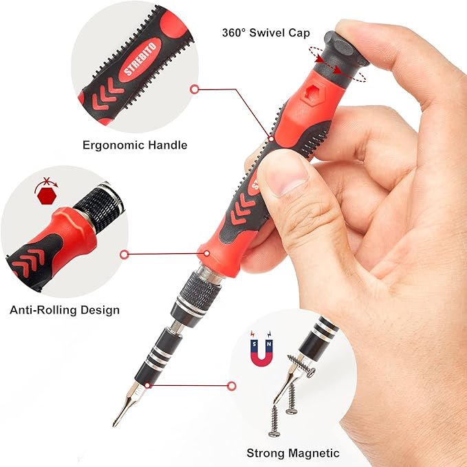 - 【Innovation Design】 We have professionally designed this laptop screwdriver kit for maximum humanization, make your repair job easier and more efficient. The screwdriver features a non-slip grip and rubberized, ergonomic handle with swivel top, provides a comfortable grip and smoothly spinning. Magnetic bit holder transmits magnetism through the bit, helping you handle tiny screws. And flexible extension shaft is 360° bendable, perfect for removing fastener in tight spots