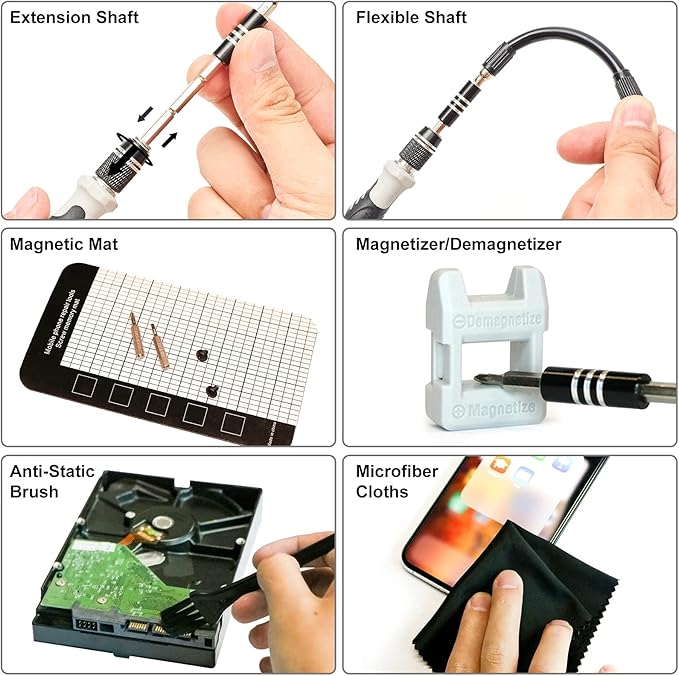 - 【Precision Tool Kit】This computer tool kit offers maximum utility with 23 practical repair tools. Magnetizer Demagnetizer Tool helps magnetize bits to grab screws, or demagnetize it to safely work on sensitive electronic devices. ESD Tweezers handle screws and micro parts easily while Magnetic Mat can keep them organized, preventing from losing. Opening Tools are used for prying, sliding and opening. Brush and Cloths are perfect for cleaning the fan and screen of your device