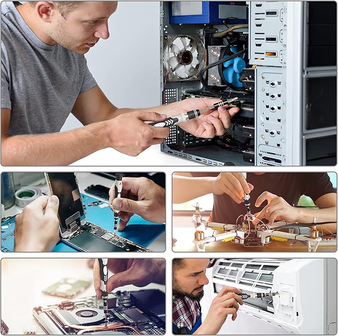 - 【Innovation Design】 We have professionally designed this laptop screwdriver kit for maximum humanization, make your repair job easier and more efficient. The screwdriver features a non-slip grip and rubberized, ergonomic handle with swivel top, provides a comfortable grip and smoothly spinning. Magnetic bit holder transmits magnetism through the bit, helping you handle tiny screws. And flexible extension shaft is 360° bendable, perfect for removing fastener in tight spots