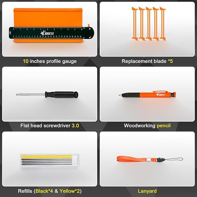 - Complete Set: Includes a 10-inch contour gauge, construction pencil, refills, flathead screwdriver, lanyard and 5 spare plastic blades.