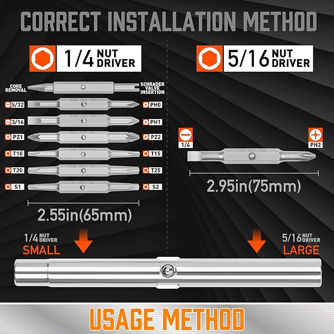 - [High-Quality]: Industrial strength heat treated bits, Phillips Bit:PH0 PH1 PH2, Pozidriv Bit:PZ1 PZ2, Torx bit:T10 T15 T20 T25, Square Bit:S1 S2, Slotted Bit:5/32" 3/16" 1/4", Nut Driver:1/4” 5/16”, Core removal and schrader valve insertion bit.