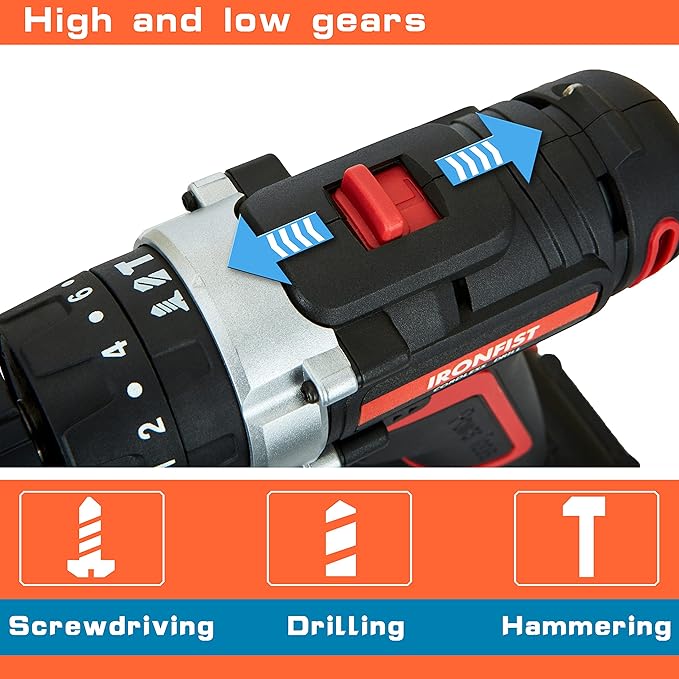 - 3 IN 1 WORKING: IRONFIST cordless drill with 3 working type. Hammering type with impact, work for concrete, brick, wall and head material; Drilling type work for wood, plastic and soft material; Screwdriving type work for screw with 1-18 torque setting, it quick change suitable for any work.
