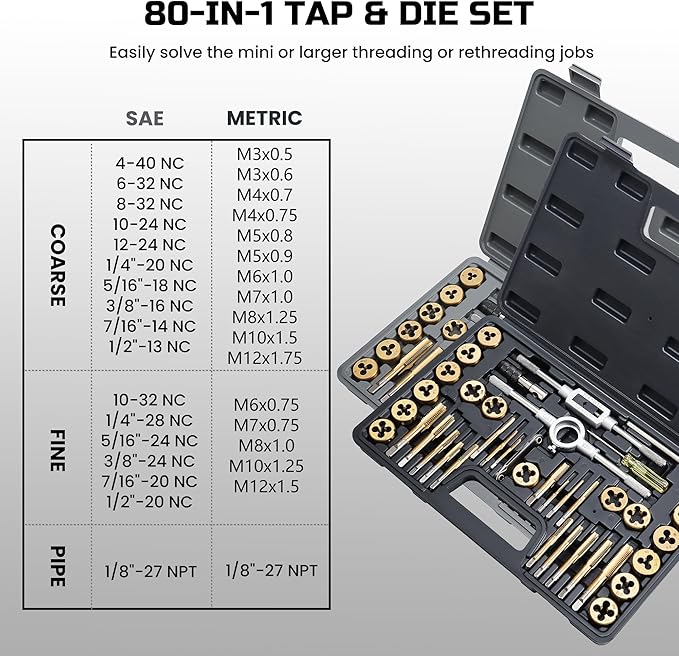 Brass Coated 80pcs SAE & Metric Tap and Die Set, Metric Standard Rethreading Tool Kit, Coarse and Fine Threads for Cutting External and Internal Threads, Essential Repair Tool Kit with Case