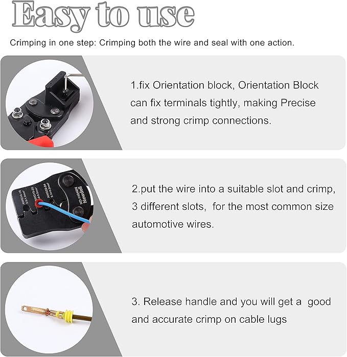 - 【Fast Connection & Sealed】Mountable locator holds the terminal position during the crimping process to help you complete the crimping work quickly and steadily. Locator should be removed when crimping Metri Pack terminals.Crimp tool is suitable for Crimping Delphi Weather-pack or Metri-Pack terminals connectors.