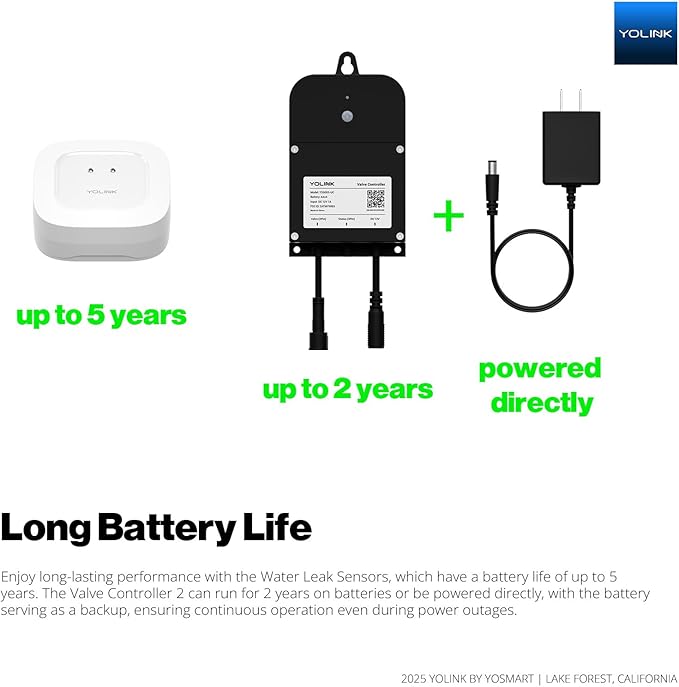 - Long Battery Life: Enjoy long-lasting performance with the Water Leak Sensors, which have a battery life of up to 5 years. The Valve Controller 2 can run for 2 years on batteries or be powered directly, with the battery serving as a backup, ensuring continuous operation even during power outages.