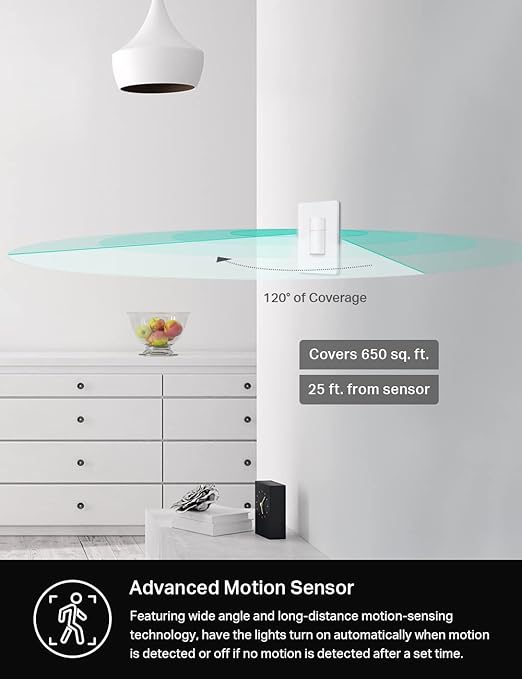 - 【Advanced Motion Detection】Completely hands-free and smart operation of your connected lights. The switch automatically turns lights on when motion is detected and turns off after a preset time. Ideal for areas such as bedrooms, hallways and restrooms where hands-free operation is ideal.