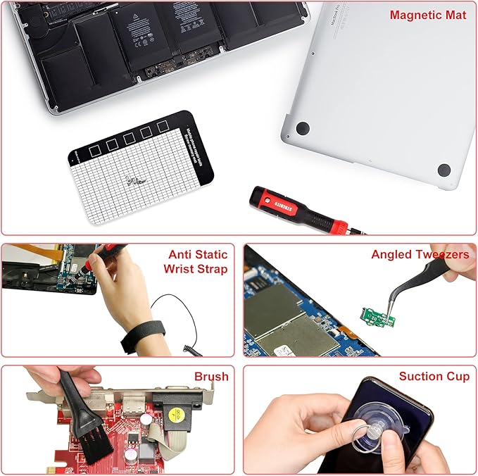 - 【Practical Accessories】This electronics tool kit contains 27 effective tools for different repair needs. The anti-static wrist strap helps protect your electronics from ESD damage. Magnetizer demagnetizer tool strengthen magnetism of the tips for grabbing screws easily, or weaken for protecting sensitive electronics. Magnetic mat keeps screws and parts organized, prevent from losing and messing up. Suction cup is used for removing phone and tablet screen. Brush and Cloth are ideal for cleaning