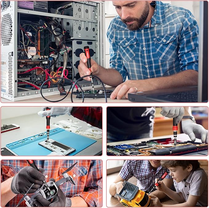 - 【Professional Design】Our computer tool kit has been humanized designed to maximize your fix capabilities. The knurled grip handle of the screwdrivers is ergonomically shaped and made by pro material to prevent slipping, deliver comfortable control and maximum torque. Bit drivers feature magnetic to easily hold bits and pull screws out. Clearly visible size markings on each bit make size identification quick. For most commonly used bits, the bit kit gives you duplicates in case one gets lost