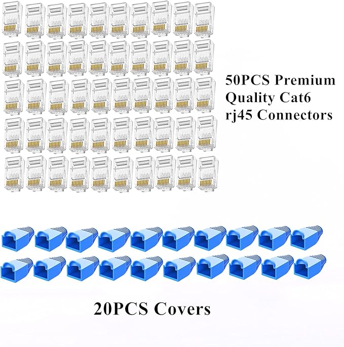 - Enough 50pcs rj45 Cat6 Pass Through Connectors, 20pcs Covers: It comes with 50pcs nice quality rj45 cat6 pass through connectors, let the network faster, enough for we use. It also comes with 20pcs covers for j45 cat5, cat5e, cat6 connectors ( Covers not for cat6A, cat7 connectors ect)