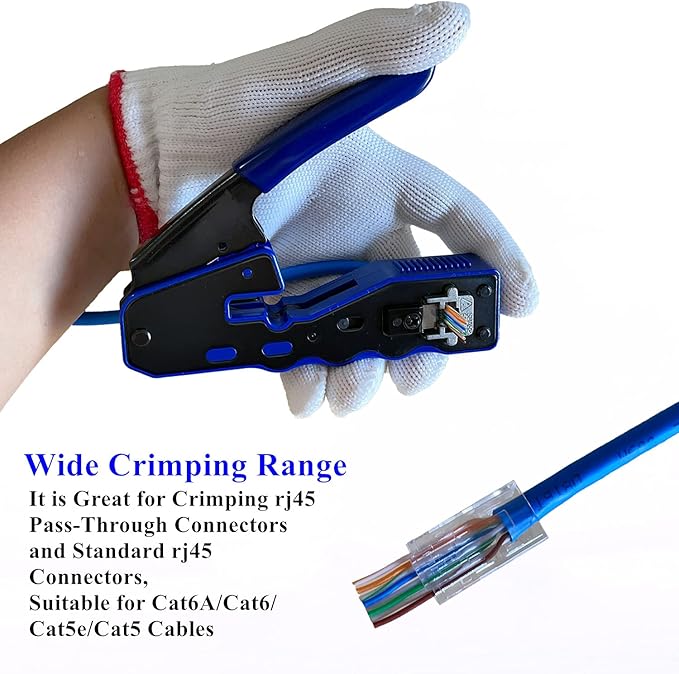 - Pass Through and Standard rj45 Cat5/ Cat6 Crimper / Cutter / Stripper: Professional and premium tool can cut, strip, and crimp cat5, cat5e and cat6, cat6A cables, fast and reliable, compatible with rj45 standard connectors and rj45 pass through connectors