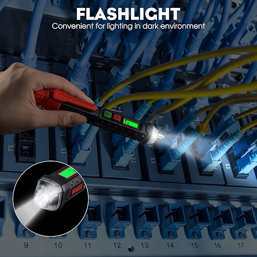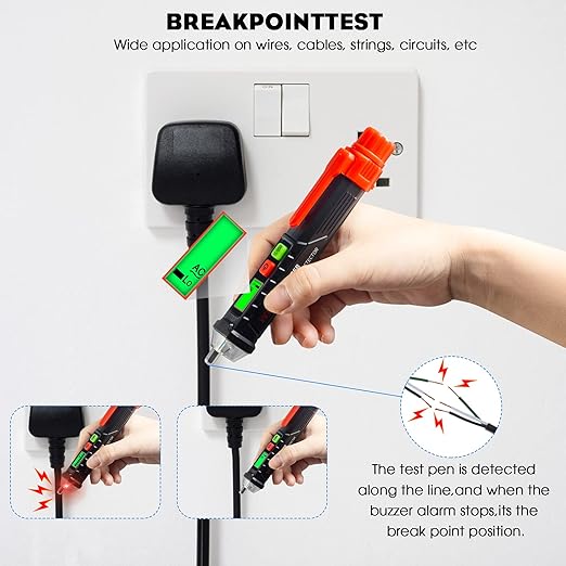 - โ ใSafe & Non-Contact Voltage Testingใ: No direct wire contact neededโsimply bring the NCV probe close to outlets, wires, or terminals. A red light and audible buzzer will immediately alert you to the presence of live voltage, helping you stay safe while working.