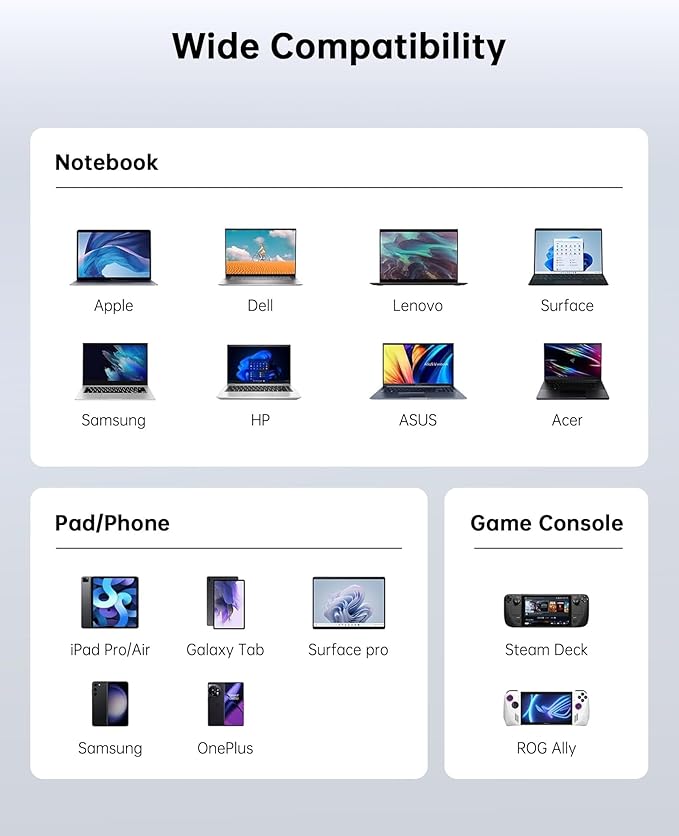 - Compatible Devices : Laptops,MacBook,Projector,HDTV,Monitor,Dell, HP, Lenovo, iPad, iPhone 15 Series, ASUS ROG Ally / Steam Deck / MacBook / MacBook Pro(2021/2020/2019/2018); Macbook Air 2018-2020, Mac mini 2018-2020, iPad Pro/ Air 2018/2020, iPad mini 6; Dell XPS 9380/ XPS 13 9365/ XPS 15 2018; Dell Latitude E7370/ E7470/ E7480/ Dell Latitude 13 7000/ E7370L/ New XPS 15 i7 Lenovo Yoga 720-13IKB/Yoga 910; Yoga15 Thinkpad Ultrabook Pro; Thinkpad E590/ Thinkpad P72/ Lenovo C930; Microsoft Surface Book 2/ Surface Laptop 3; Surface Pro 7/ Surface Pro 8/ Surface Go; Galaxy Book Flex Alpha 2-in-1 13.3" QLED Touch-Screen Laptop; Galaxy Tab S5e/ Galaxy Tab S4; HP Spectre Laptop 13-af001TU/ Spectre x360 13t; Elitebook 840 G5 series/ Elitebook x360 1030 G3; Envy Geforce mx250/ Z book 15u G3 ASUS Zenbook UX330UA/ Zenbook Flip ux370u; Acer Aspire 5 2019; D17w3 Aspire c24-865; Samsung Galaxy S10+/ S10/ S9+/ S9/ S8+/ S8 Plus; Note 10/ 9/ 8 Laptops,MacBook,Projector,HDTV,Monitor,Dell, HP, Lenovo, iPad, iPhone 15 Series, ASUS ROG Ally / Steam Deck / MacBook / MacBook Pro(2021/2020/2019/2018); Macb… See more